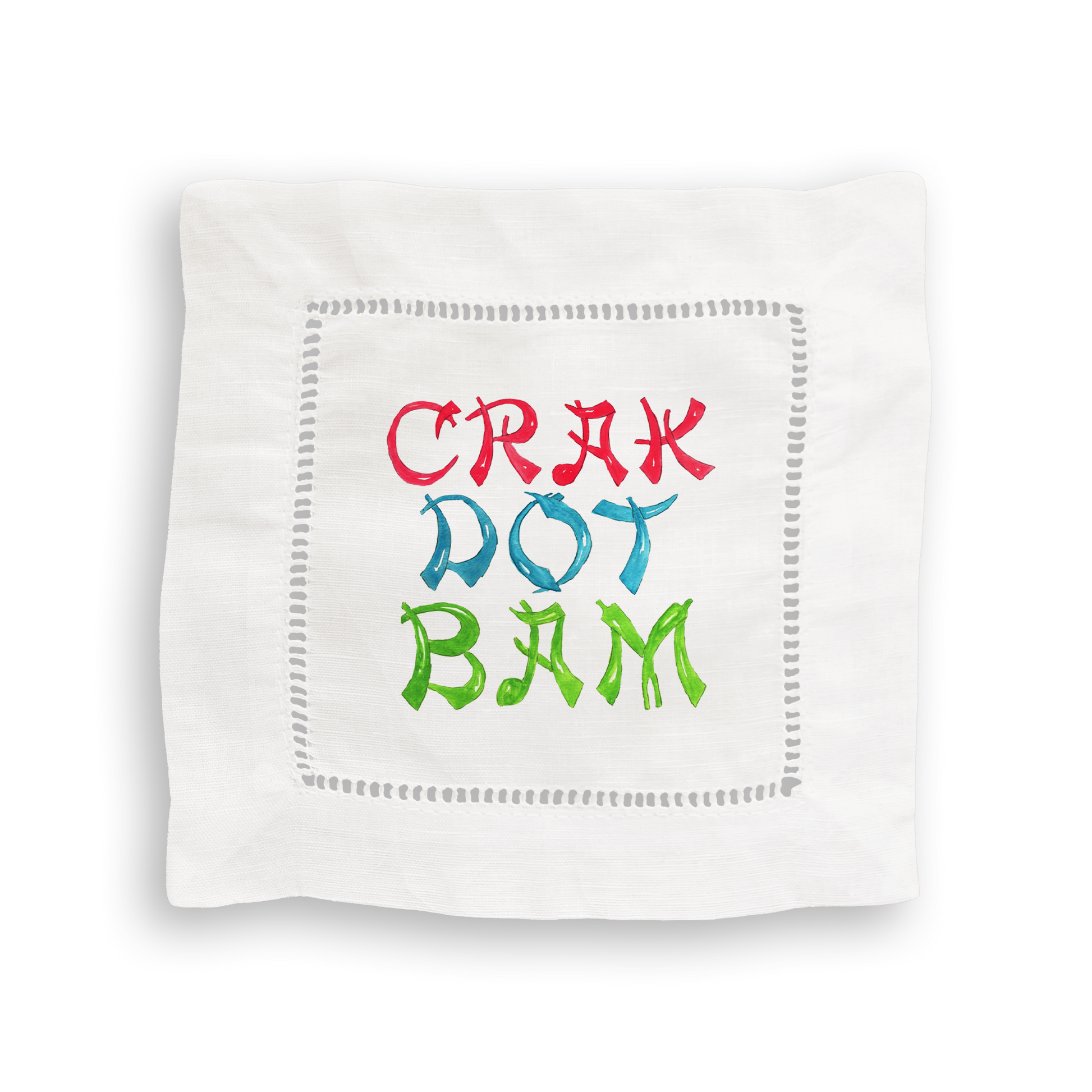 Mixed boxed set of four linen hemstitch cocktail napkins tucked in a yardstick folded sleeve custom printed to order with our original artwork. Dimensions are approximately 6" x 6" Care: machine wash, line dry only