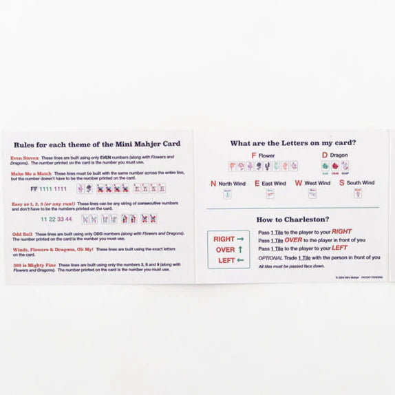 The Mini Mahjer Card is the first of its kind, designed to introduce kids aged 6 and up to the exciting world of Mahjong. The Mini Mahjer Card make the game accessible to younger players by offering fewer options and simplified combinations