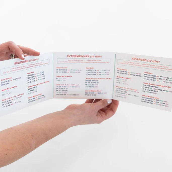 With three levels of play — Beginner (8 tile long combinations), Intermediate (10 tile long combinations) and Advanced (12 tile long combinations) — The Mini Mahjer Card grows with your family, making every family game night a new adventure.