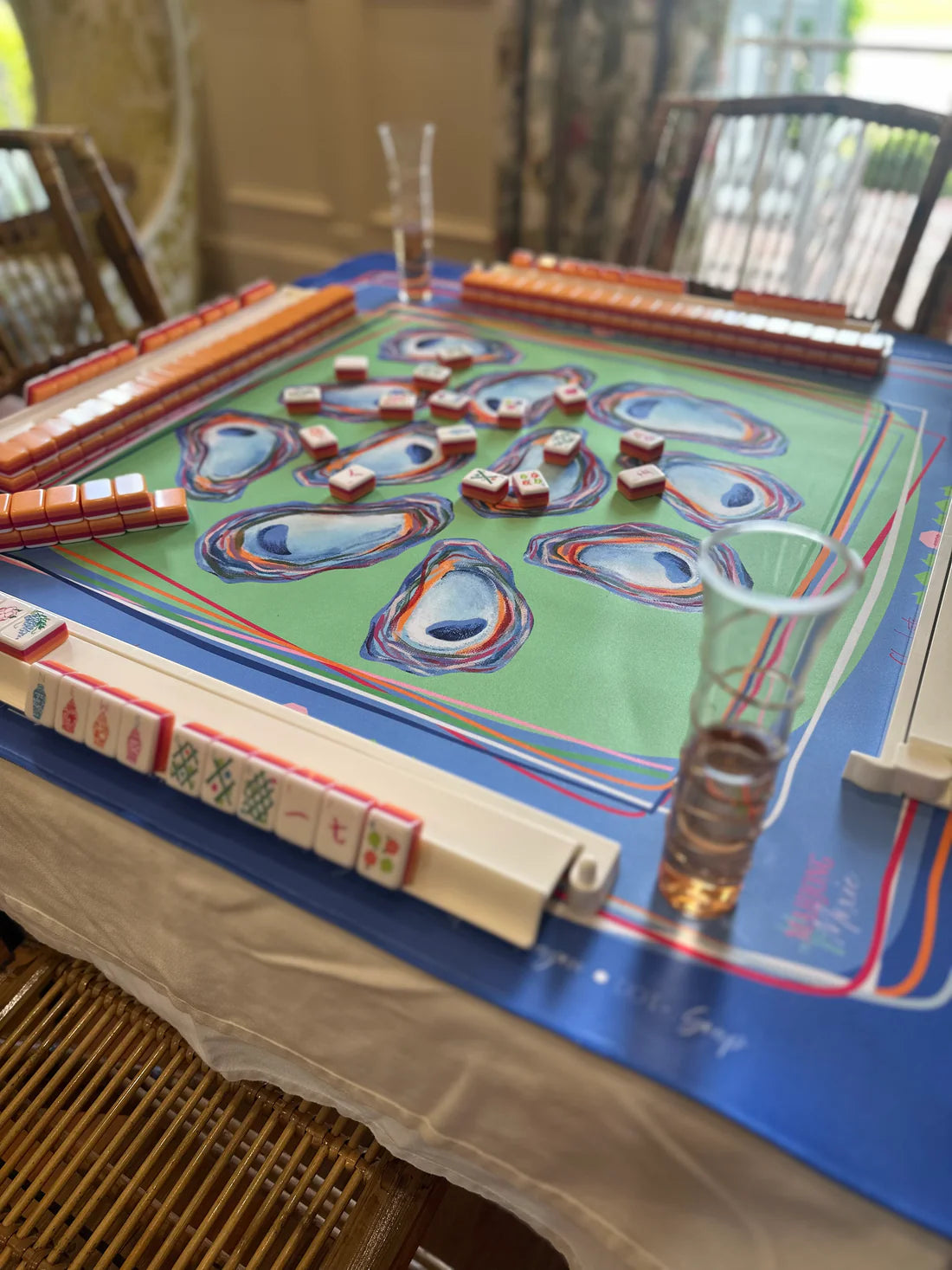 Our Oyster Confetti mat is a celebration of coastal charm and colorful gameplay. Featuring hand-painted oyster shells in painterly hues and layered ribbon-like borders, this design brings a preppy, Southern twist to your Mahjong table. The mat includes all the classic gameplay guides you need — Charleston steps, wall building, dice direction, and tile placement — so whether you're a seasoned shark or a stylish beginner, you’re ready to play in full color.