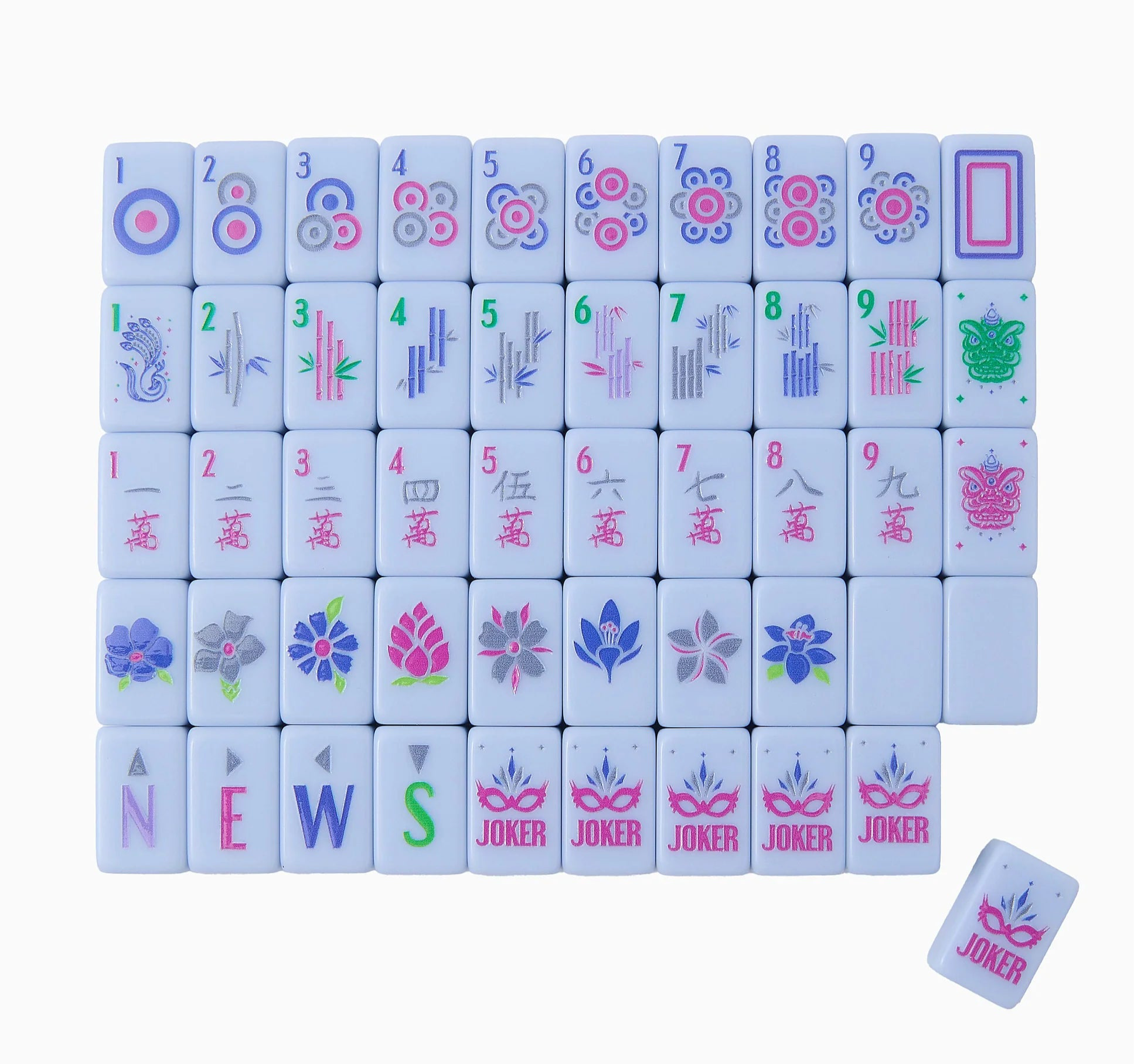 The set includes 160 Mahjong Tiles, 4 White Wooden Racks, Mahjong Mat, Tile Tote and Travel Bag that carries everything.