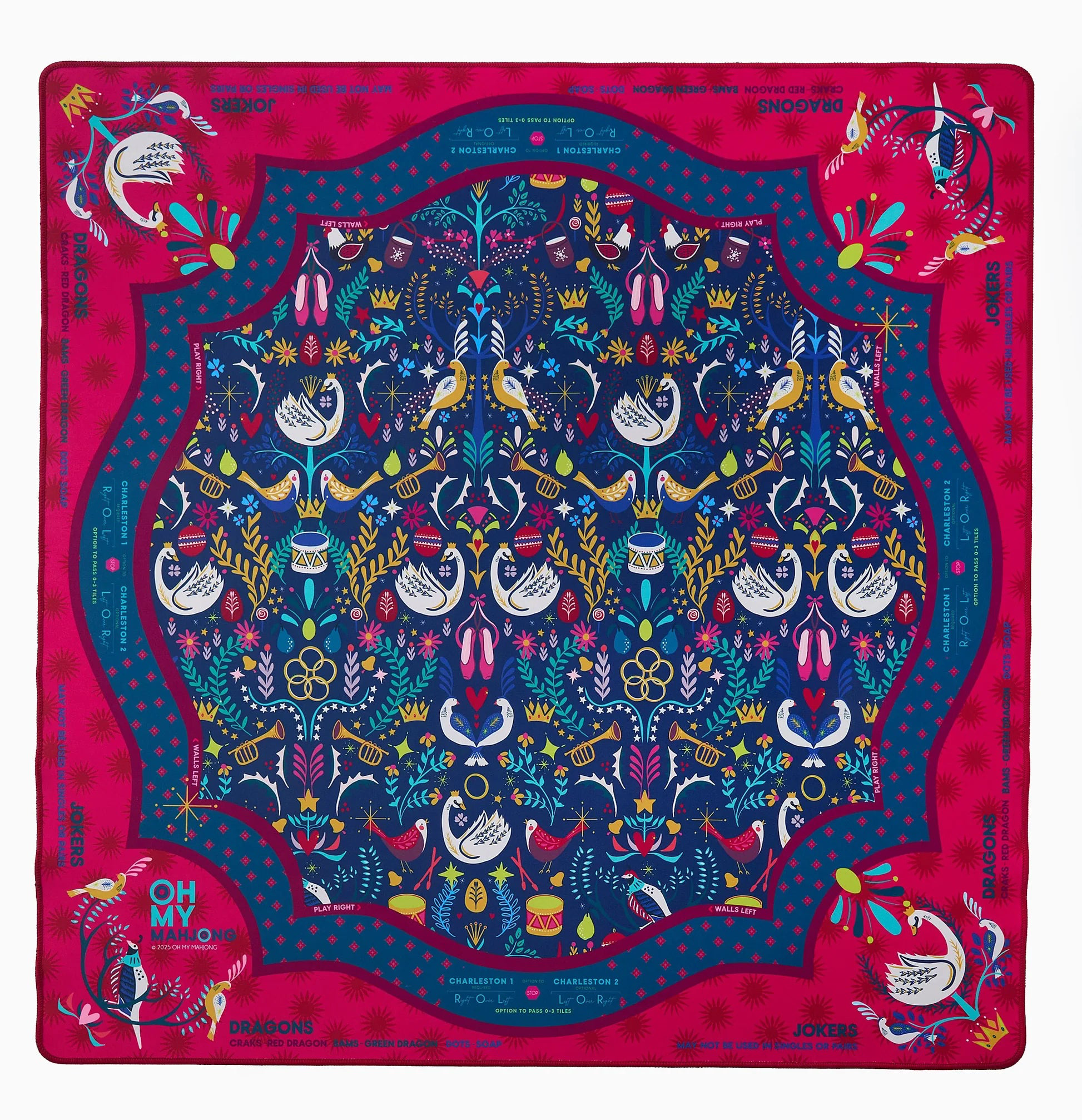 Step into the season with the Pear Tree Mahjong Mat by Oh My Mahjong, a festive collaboration with Fort Worth-based fashion designer Sheridan French. Inspired by the beloved 12 Days of Christmas, this holiday edition features intricate illustrations of each iconic gift, from the partridge to the drummers, brought to life in rich winter tones of forest green, berry, and navy. The Pear Tree Mat was designed to capture the magic, nostalgia, and elegance of the holiday season, and is the perfect backdrop for cozy game nights and joyful gatherings.