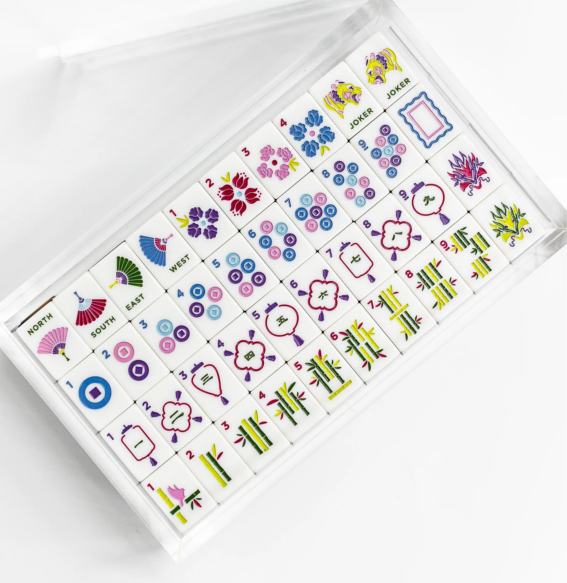• 160 tiles (36 bams, 36 craks, 36 dots, 8 flowers, 16 winds, 12 dragons, 10 jokers, 6 blanks). Remove 2 jokers and 6 blanks for National Mah Jongg League play.