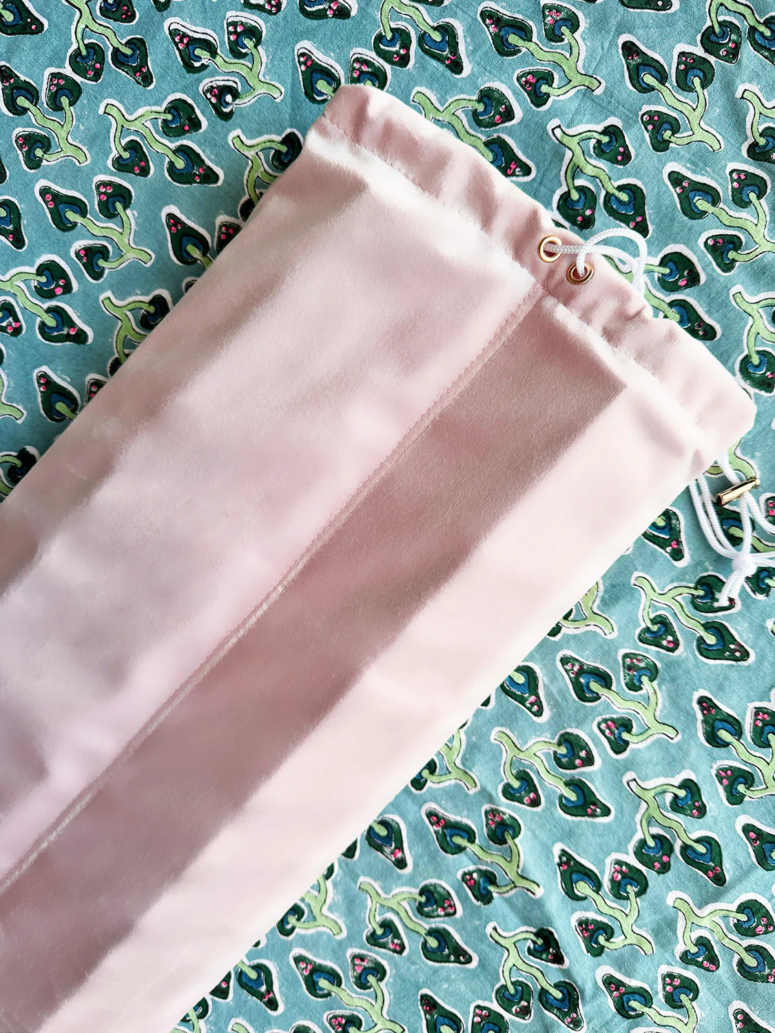 Bags are made of soft gray velvet and inside you will find 4 compartments, one for each rack+pusher. Each side of the bag closes securely with metal cord stoppers. Our bags fit our 20" racks perfectly and work great for any racks 20" or shorter.