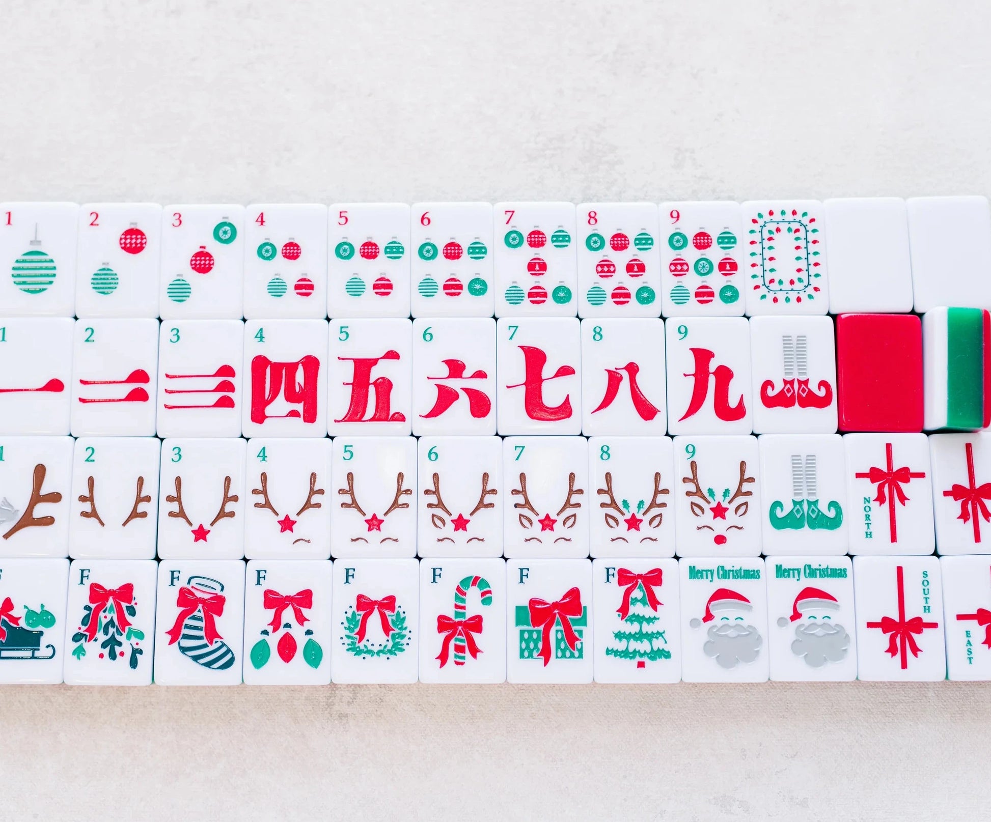Acrylic hand-painted tiles, with a thoughtful design to spread Holiday Cheer to you & your Mahjong group! Rudolph certainly has had his fair share of the lime light and these tiles will too! This collection from Hip Hip Mahjong takes center stage with a 3 layer tile in winter green, rudolph red and white snow.  Each tile shows off cheery images telling a festive story each time you play!  But what truly makes this set glow are the bams, 1-9 builds a Rudolph! Symbolizing the inner struggles we all face, letting go of the judgement from others, our need for approval, learning to accept ourselves for who we are created to be and ultimately shining our light. May we all love our inner Rudolph despite what people say, think or do to us!